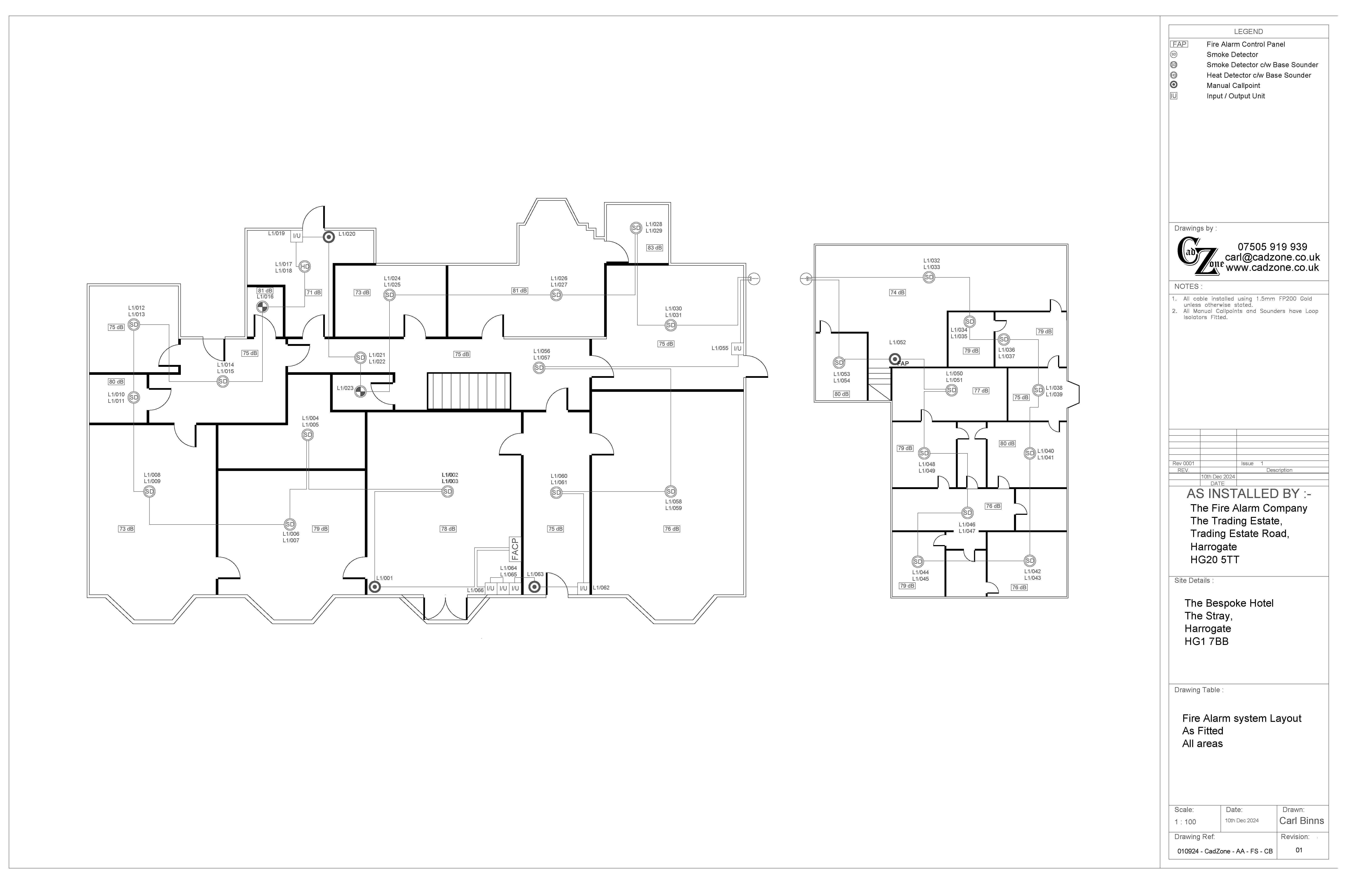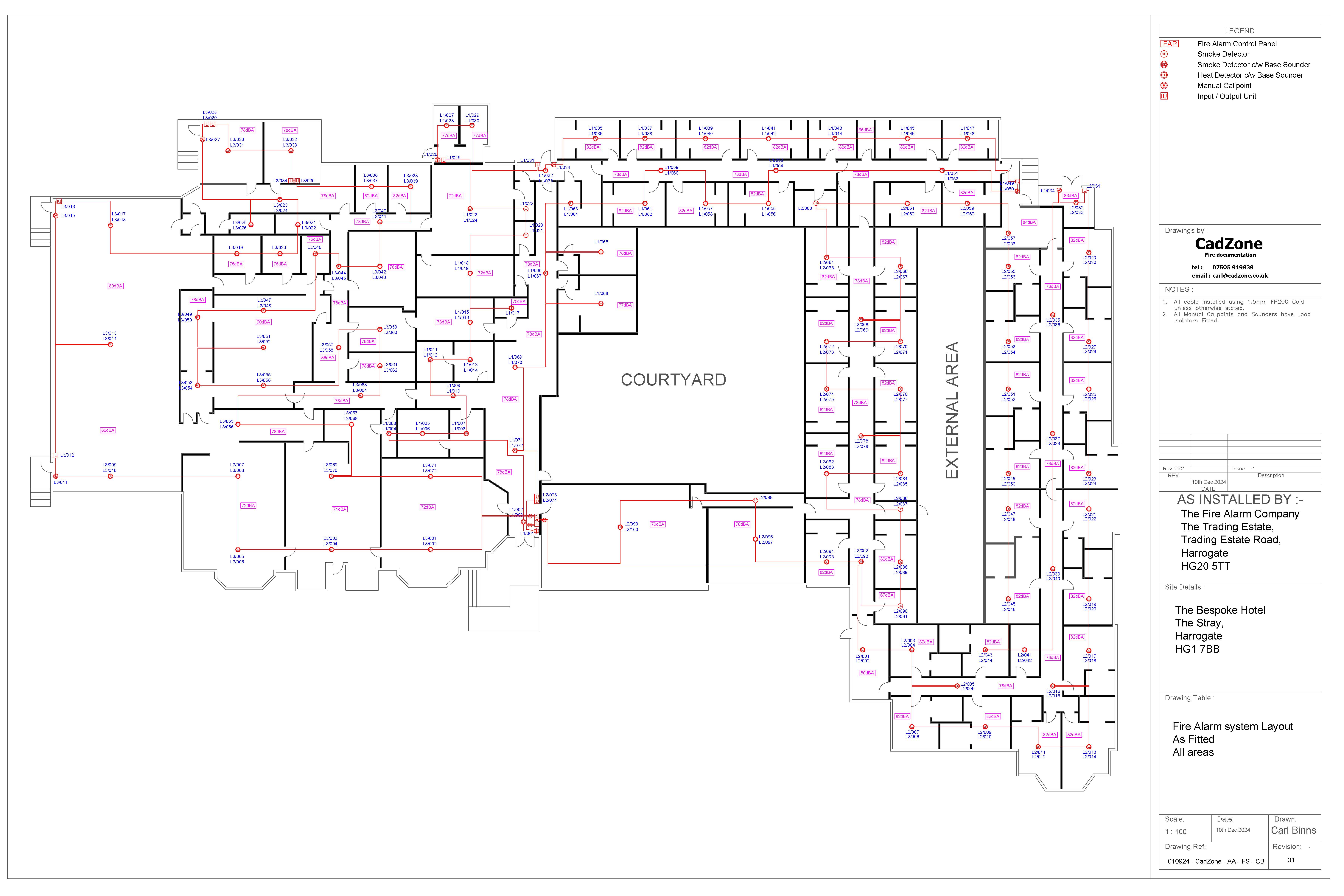 An As Fitted Drawing (also known as "As Built" Drawings) is a comprehensive technical document that precisely illustrates the exact layout and intricate details of an installed fire detection and alarm system after its complete installation. Under the BS 5839-1:2017 British standard for fire detection and fire alarm systems in non-domestic buildings, these drawings are critical for ensuring that a fire alarm system is meticulously documented, maintainable, and compliant with the highest safety standards.